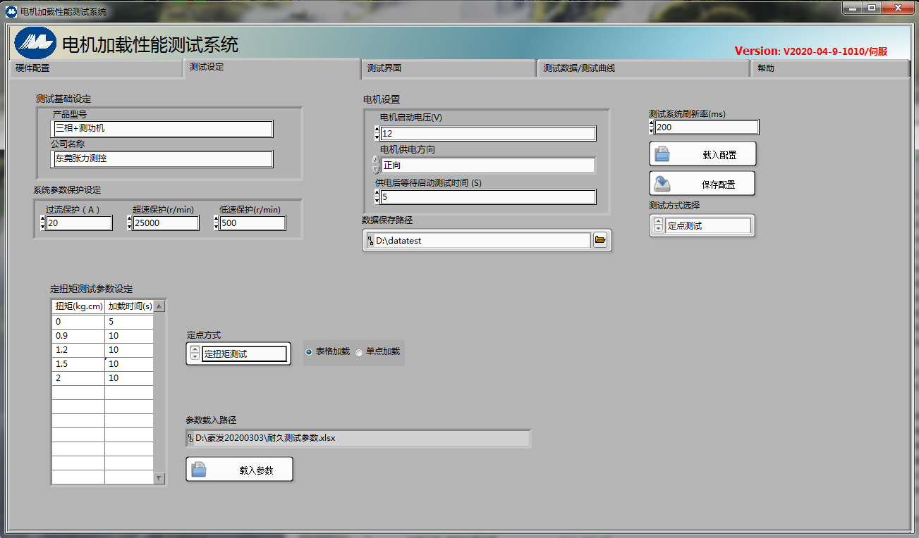 •測試界面:測試界面可以實時顯示測試的瞬時值(電壓、電流、轉速、轉矩、 輸入功率、輸出功率、效率),并可以間按一定的時間(隨意設定)采集數據。同時在測試過程中曲線自動繪制。更好的監控測試的過程。