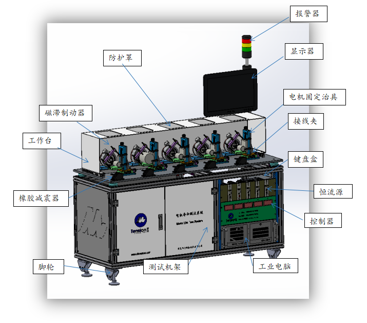 •可以通過改變制動器電流來設定不同的電機加載,同時可以通過上位機軟件任意設定電機的工作與停止時間,最高工作循環為99.99萬次,循環次數達到后自動停機,其中任何一工位出現問題只會自動停止該工位的運行