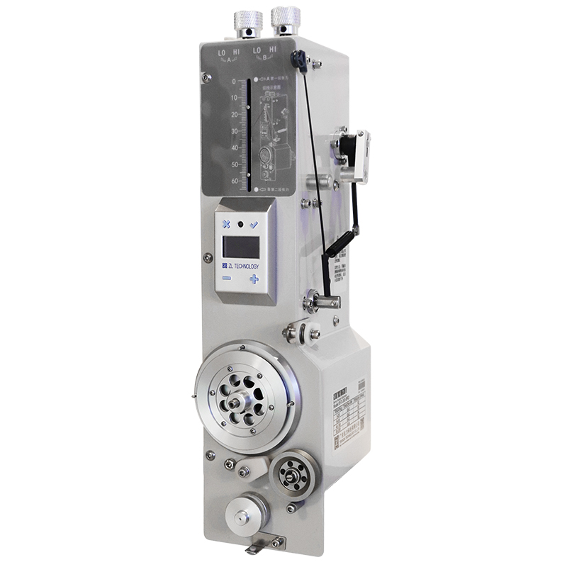 SF3-BRD系列帶氣缸且張力輪在正面的伺服張力器。該系列產(chǎn)品最高繞線速度可達(dá)20m/s,其氣缸裝在機殼內(nèi)部,具有衰減功能,未接通氣壓時,可通過張力調(diào)節(jié)旋鈕和擺動臂上下旋鈕來控制張力;在繞線、掛線等過程中的某段需要較大的張力時,可接通氣壓,此時繞線機通過電磁閥對氣閥進(jìn)行切換控制,使擺動臂擋塊擺動一定的角度,實現(xiàn)兩段張力值的切換,避免發(fā)生斷線。該系列具體型號及配置見右側(cè)表格,用戶可根據(jù)自用線徑及張力范圍選擇合適的型號。